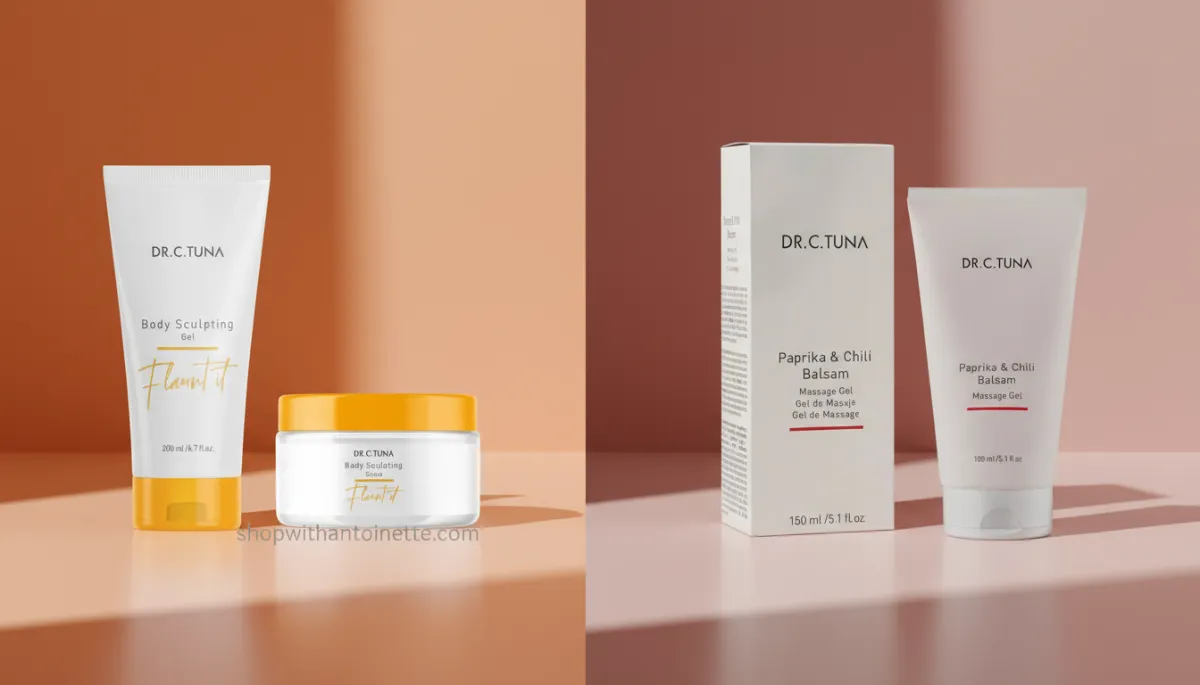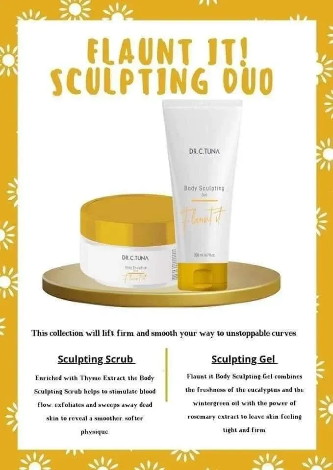 The Farmasi Dr. C. Tuna Paprika & Chili Balsam is designed to provide intense warmth to soothe sore muscles, while the Flaunt It Body Sculpting Scrub & Gel is a two-step system with a more complex ingredient profile aimed at toning and firming the skin. The Flaunt It gel produces a strong warming and tingling sensation, but the overall purpose is body-sculpting rather than muscle pain relief.